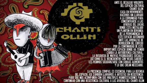 Chanti Ollín es un espacio de encuentro, de trabajo y aprendizaje con más de 13 años de existencia en donde conviven diversos colectivos de comunicación libre, de oficios, arte y cultura al servicio del pueblo y la comunidad. Luego del desalojo ilegal que vivieron el 22 de noviembre mantienen un plantón fuera de la casa que ocuparon como espacio de trabajo y resistencia.