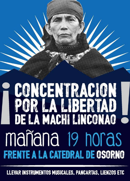 Frente a la catedral de Chawrakawin,Osorno, en la plaza de Armas, se hace un llamado a asistir a la concentración en solidaridad y apoyo por la libertad de la Machi Francisca Linconao, quien se encuentra actualmente en huelga de hambre, junto a 5 comuneros Mapuche en la cárcel de Temuco.