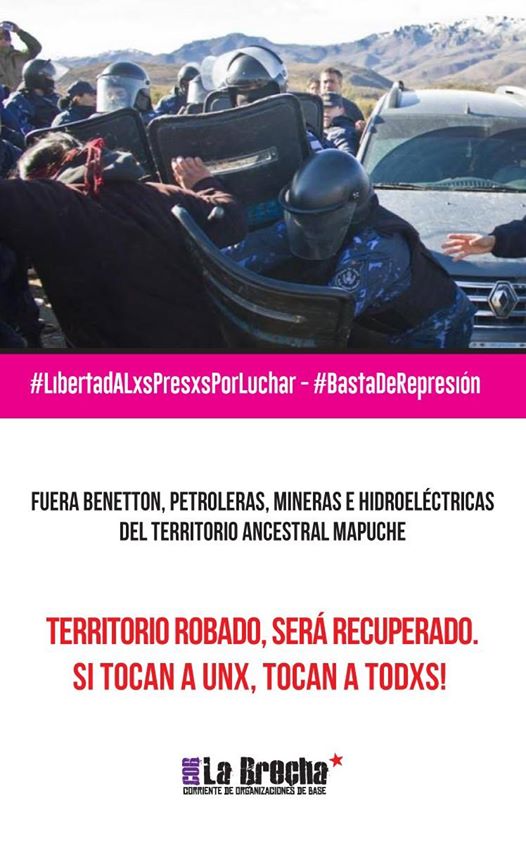 Desde COB La Brecha nos solidarizamos con las comunidades mapuche Pu Lof en Resistencia del Departamento de Cushamen (Chubut) y convocamos a continuar movilizadxs repudiando la brutal represión que están ejerciendo las fuerzas del Estado provincial y nacional contra nuestrxs hermanxs mapuches, exigiendo el cese de la misma y la inmediata liberación de lxs compañerxs detenidxs!
