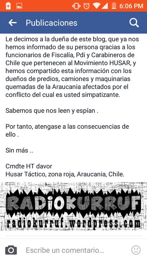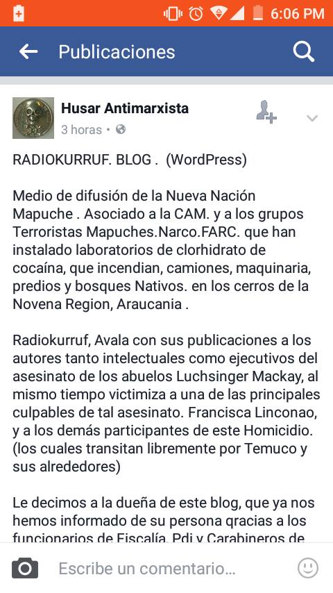 – Frente a las psicóticas aseveraciones, vinculaciones y amenazas de Husar Antimarxista, tenemos la responsabilidad de dejar en claro que nuestra iniciativa es generada por mujeres y hombres en base a un tejido horizontal, apoyado por una inmensidad de individualidades y medios que nos hacen llegar sus registros diariamente. Es por esto que reiteramos: somos un medio de comunicación y contrainformación radial, escrito y audiovisual de carácter autónomo y comunitario que promueve el ejercicio del derecho a la información de los hechos que acontecen en el Wallmapu, Abya Yala, Latinoamèrica y el mundo. Información que los grandes medios ocultan.