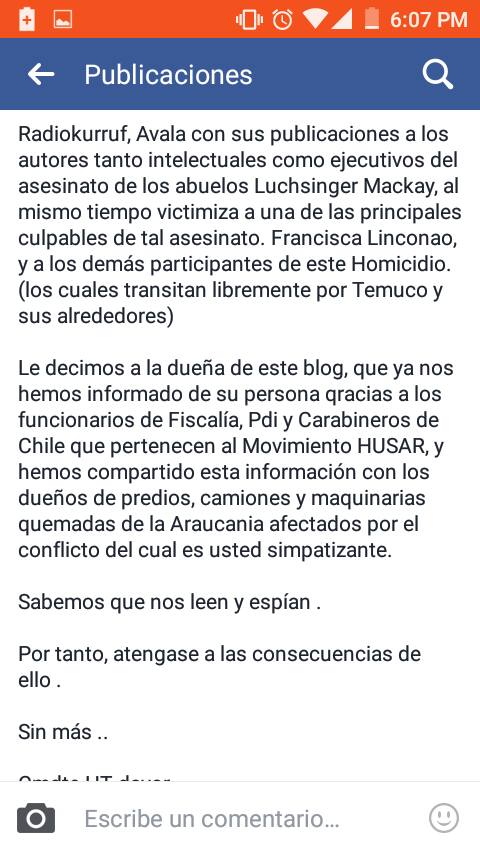– Repudiamos el actuar cobarde de grupos terroristas como Husares Antimarxitas que amparados en la impunidad de la legalidad vigente han amenazado a comunicadores sociales como Felipe Durán, a la ex consejera de la CONADI Ana Llao y ahora último con amenazas de muerte a la Machi Francisca Linconao, y todo esto sumado a la presunta participación de este grupo en el secuestro al Longko Victor Queipul. Todo lo cual aún es materia de investigación por los organismos pertinentes, y preocupación por parte de Amnistía Internacional.