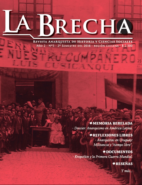 La Revista Anarquista de Historia y Ciencias Sociales “La Brecha”, en su tercera publicación- que corresponde al segundo semestre del año 2016-   “es un paso decidido hacia el mañana, que busca proyectarse como una mano fraterna hacia el pasado de las luchas y los intentos organizativos que nos precedieron, hacia quienes colaboraron en este esfuerzo de derribar naciones y ficciones, y hacia quienes quieran transformar sus páginas en fuego vivo, libre y antiautoritario”.