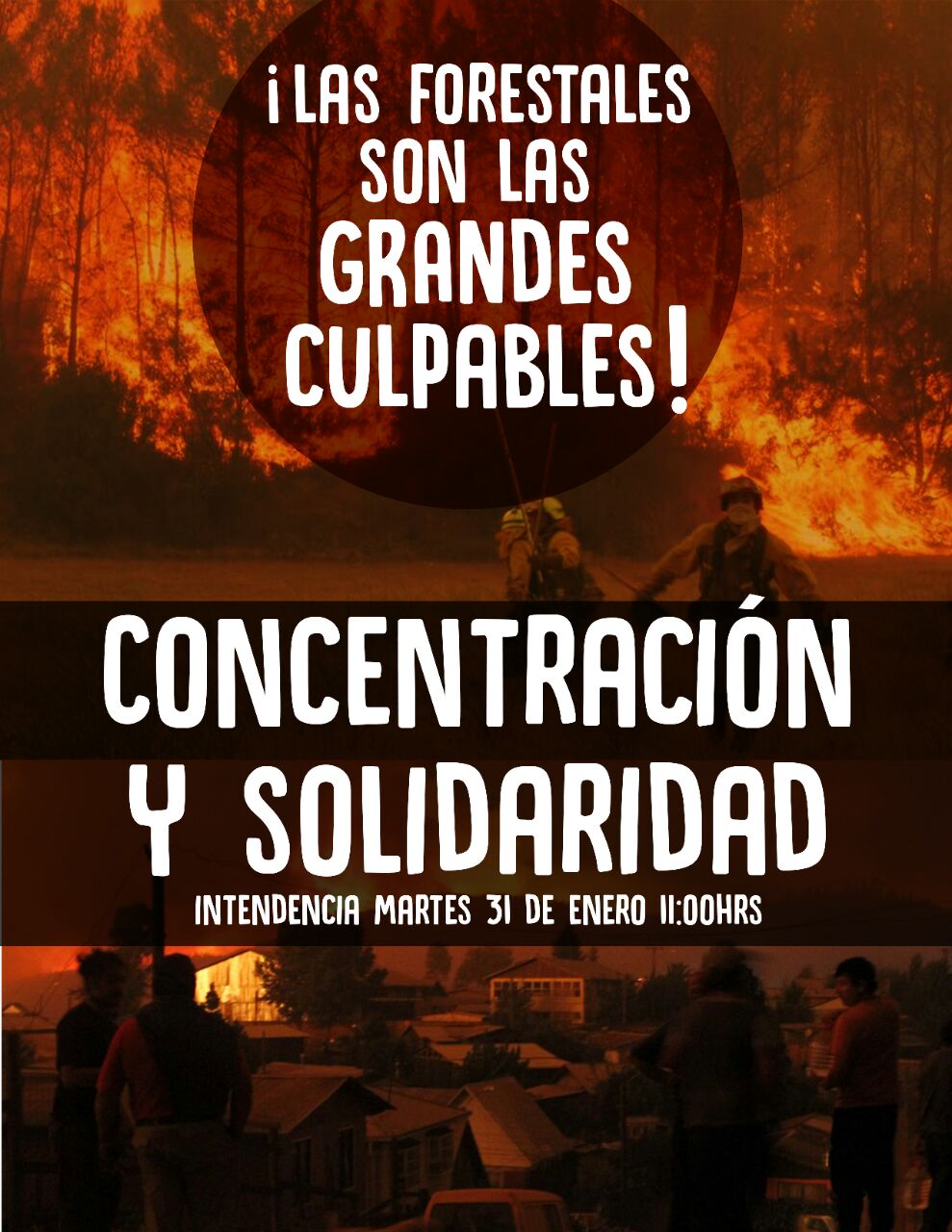 En Temuco, Región de la Araucanía, se realizará un mitin en el frontis del edificio intendencia (Claro Solar con Bulnes) convocado a las 11 de la mañana, donde enseguida se realizará un punto de prensa y el ingreso de una carta dirigida al gobierno de Chile y al Congreso de la República exigiendo el fin de todo subsidio y beneficio a los intereses forestales, en todo orden y escala, como también, el llamado a las redes de solidaridad para seguir apoyando a los afectados por el debacle de los incendios forestales.