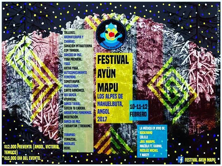 El Festival Ayün Mapu, Los Alpes, Nahuelbuta, Angol 2017 organizado por la agrupación Ayün Mapu, compuesta por personas de Angol, Victoria y Temuco, invita a toda la comunidad a compartir en un encuentro con orientación intercultural, el cual busca intercomunicar las terapias complementarias y naturales,con la historia, los saberes ancestrales mapuche y la música. En este orden, el festival se desarrollará los días: Viernes 10, Sábado 11 y Domingo 12 de Febrero en el sector Los Alpes de Nahuelbuta, subida Cañon las Asequias, Angol, región de la Araucanía.