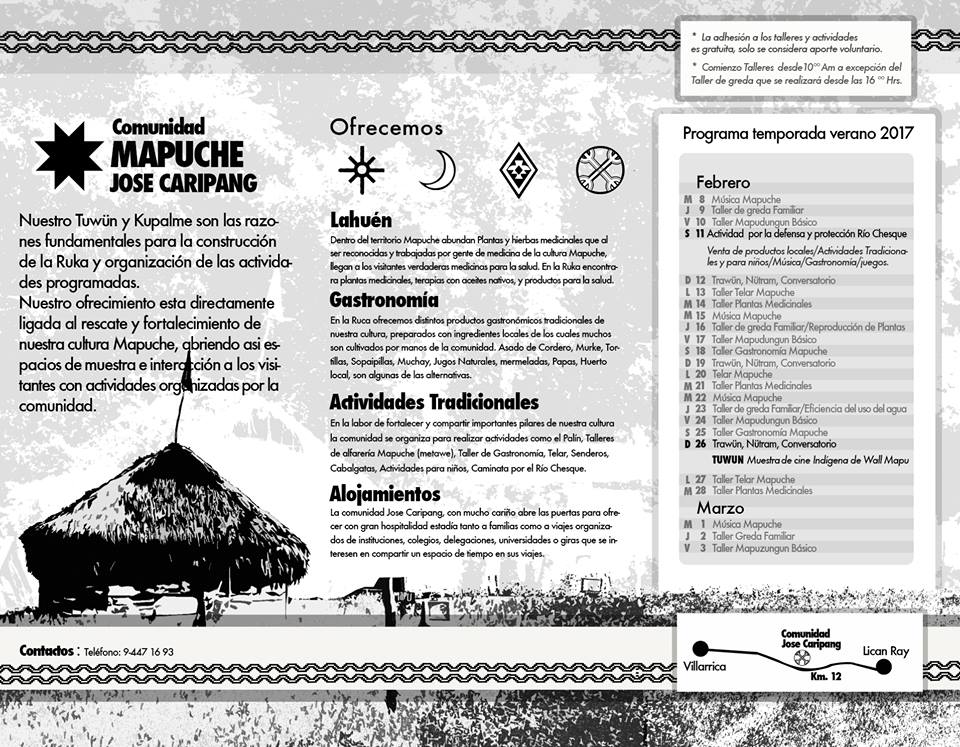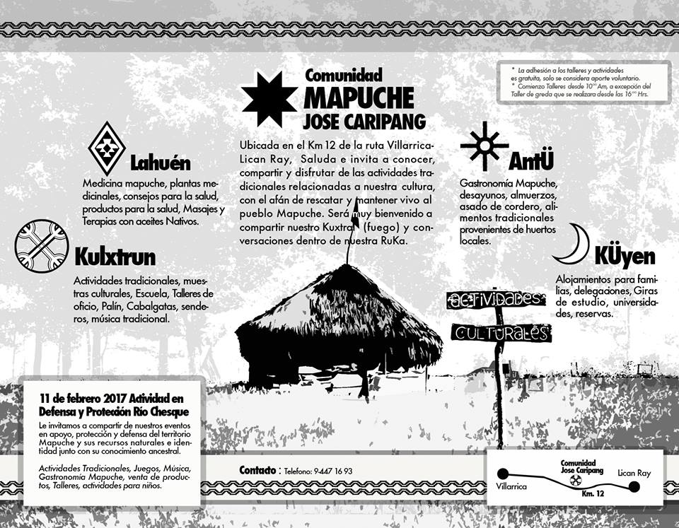 Actividades tradicionales, juegos, música, gastronomía Mapuche, productos naturales, talleres, actividades para niños/as, son parte de las iniciativas que se realizarán el sábado 11 de febrero en el kilómetro 12 de la ruta Villarrica – Lican Ray en la Ruka multipropósito al interior de la comunidad José Caripang.