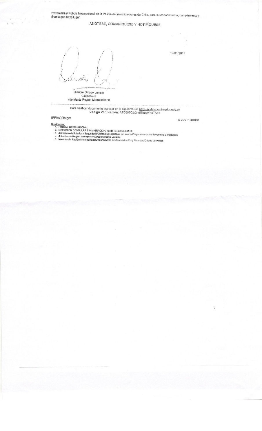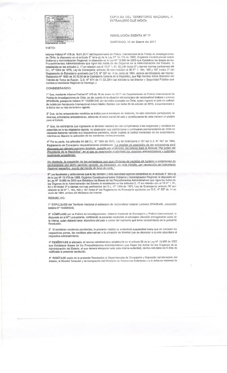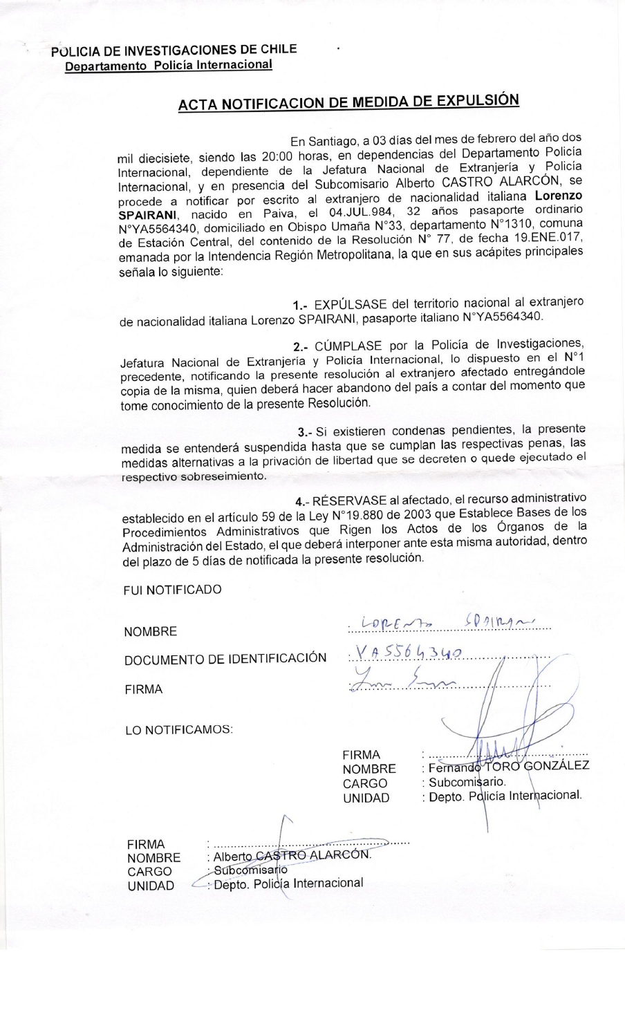 Luego fue llevado al aeropuerto y entregado a la policía italiana, siempre bajo la custodia de agentes chilenos. La orden de expulsión (adjunta), firmada por el intendente de la región Metropolitana, Claudio Orrego, señala que “el extranjero en comento, ha sido detectado participando de diversas actividades antisistémicas, alterando el orden social del país y constituyendo de esta manera un peligro para el Estado”.