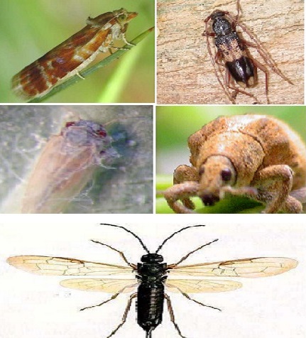 Gorgojo del Eucalipto Gonipterus spp (Coleoptera: Curculionidae).  Originario del Sudeste de Australia y Tasmania. Es considerada una de las plagas de eucalipto de mayor relevancia a nivel mundial. Tanto larvas como adultos del insecto se alimentan del follaje, ocasionando significativas disminuciones en el crecimiento de los árboles.
