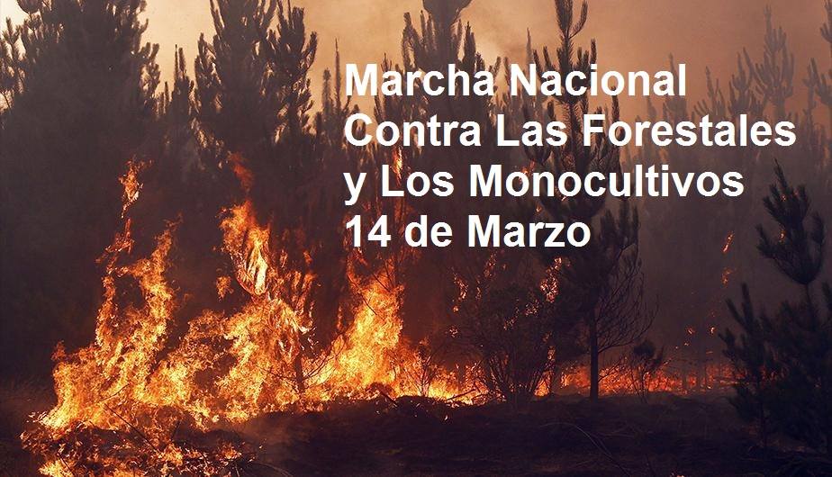 En distintas ciudades de Chile y Wallmapu, se realizarán movilizaciones, marchas y protestas éste 14 de marzo de 2017 en una jornada de Nacional con motivo de manifestar el rechazo a las empresas forestales y las plantaciones de monocultivos de pinos y eucaliptus.
