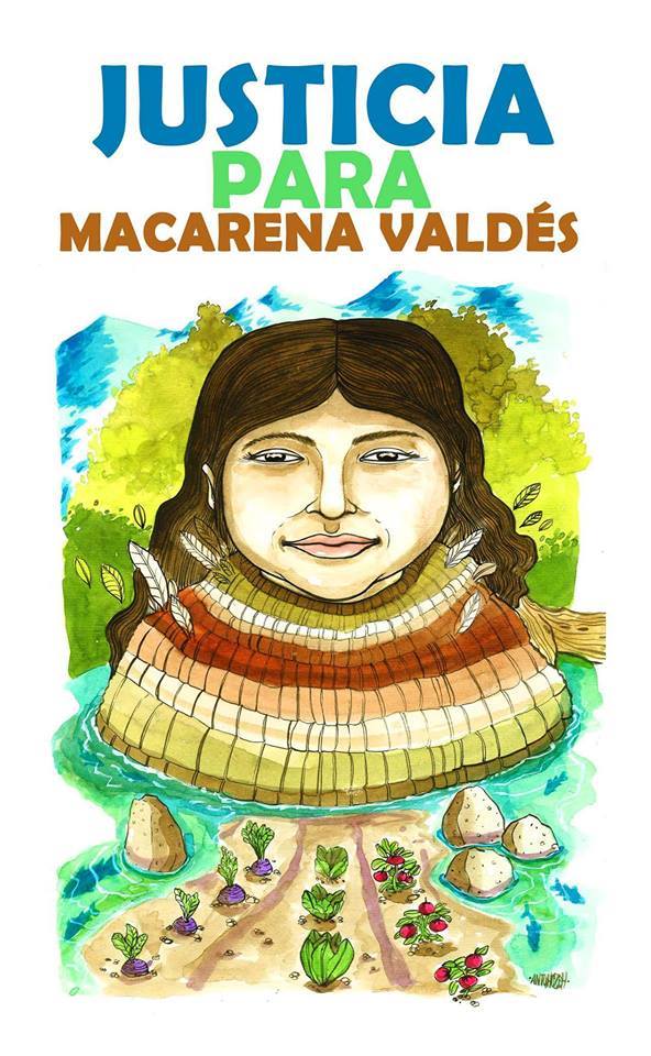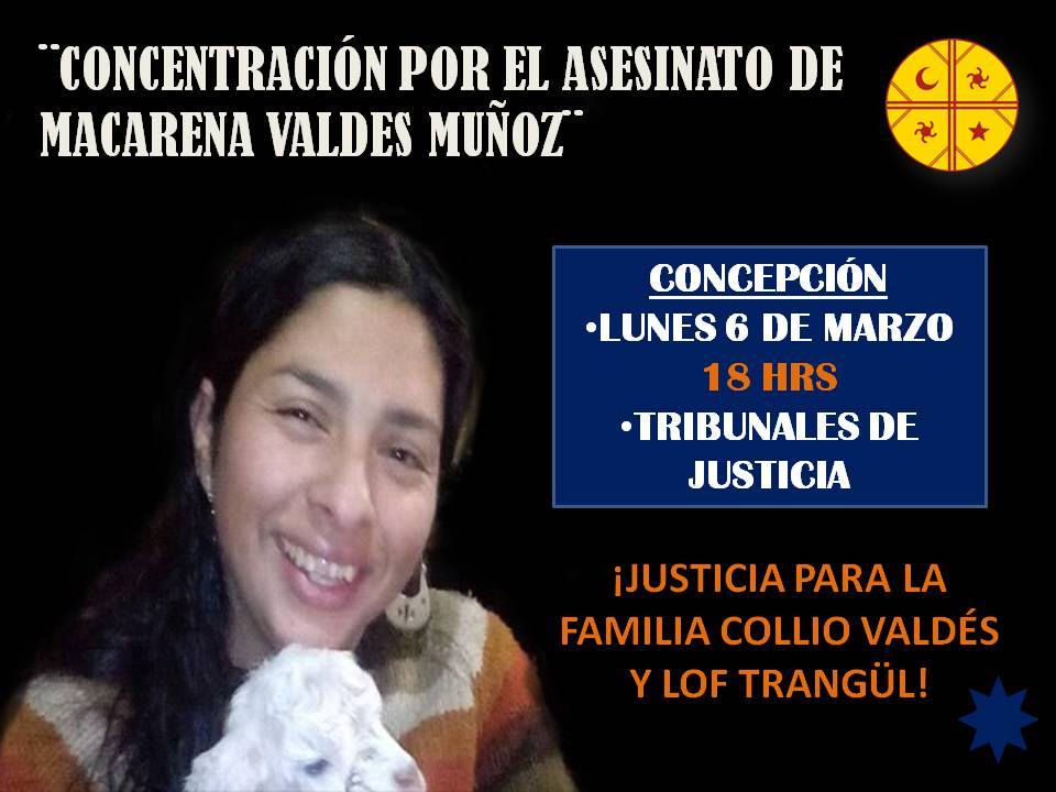Macarena Valdés Muñoz, lamgen perteneciente al lof Tranguil-Panguipulli, fue asesinada delante de su pequeño hijo en agosto del 2016. Su muerte se hizo pasar como supuesto suicidio, pero ante las extrañas circunstancias y el conflicto territorial con la transnacional RP GLOBAL se exigió abrir una investigación, la cual hoy amenaza con ser cerrada.