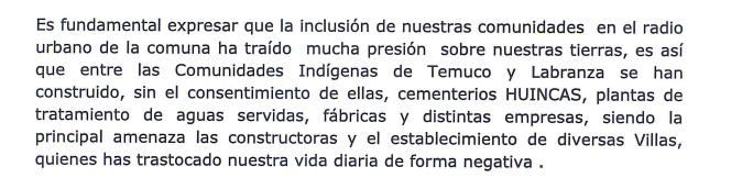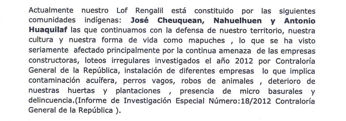 08/03/2017.- El Lof Rengalil, denuncia en documento en cual se resumen los hechos que dan como resultado la aprobación del Plan Regulador Comunal de Temuco, la inclusión arbitraria al mismo de comunidades indígenas, lo que afectaría la vida, cultura y cosmovisión de las comunidades afectadas. Con ello, solicitan «se nos saque definitivamente y lo antes posible del Radio Urbano de esta comuna» para volver a ser parte del radio rural .