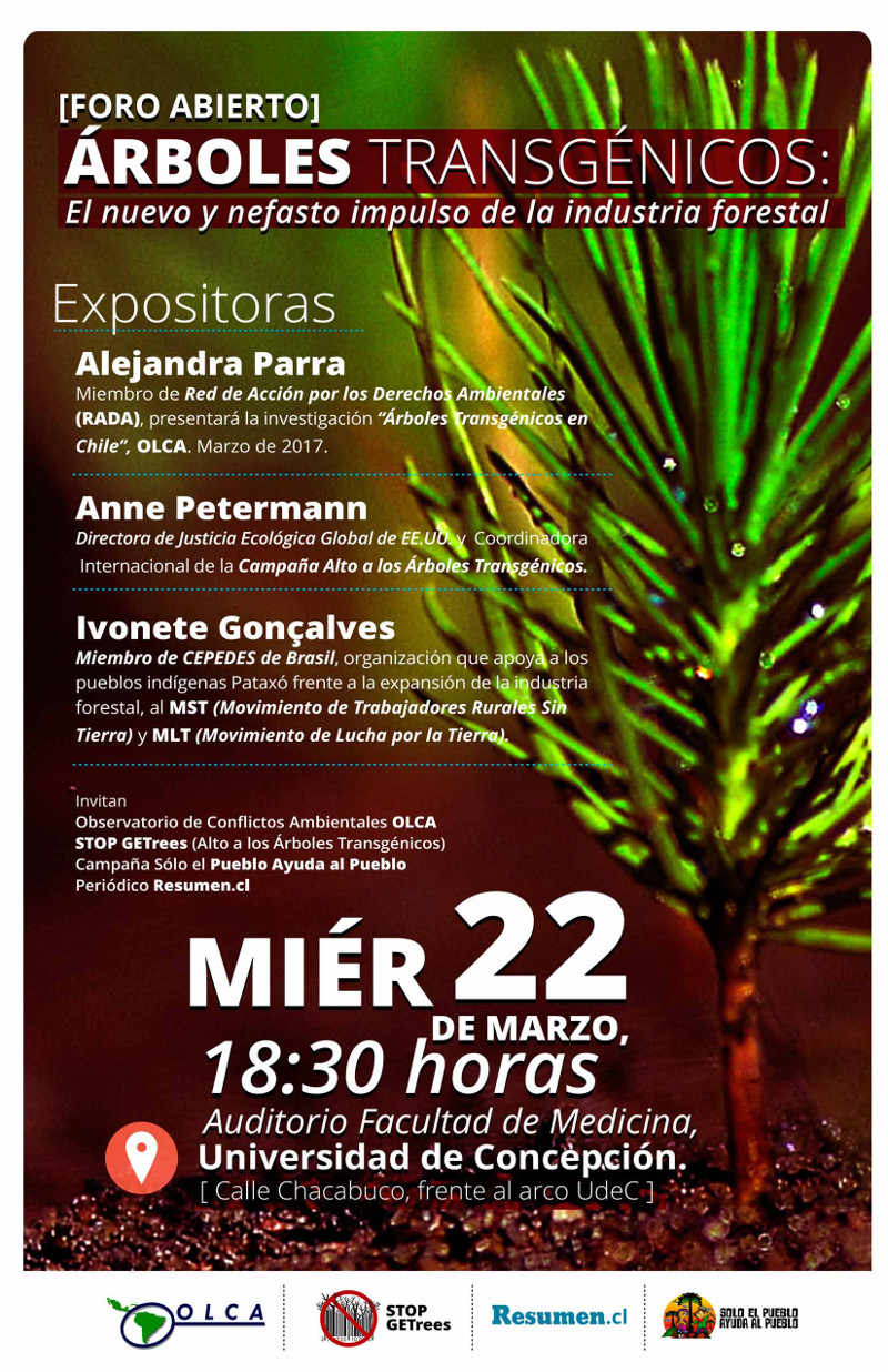 [resumen.cl] “Árboles Transgénicos: El nuevo y nefasto impulso de la industria forestal”, es el nombre del Foro que se realizará este miércoles 22 de marzo en el Auditorio de la Facultad de Medicina de la Universidad de Concepción, a las 18:30 horas.