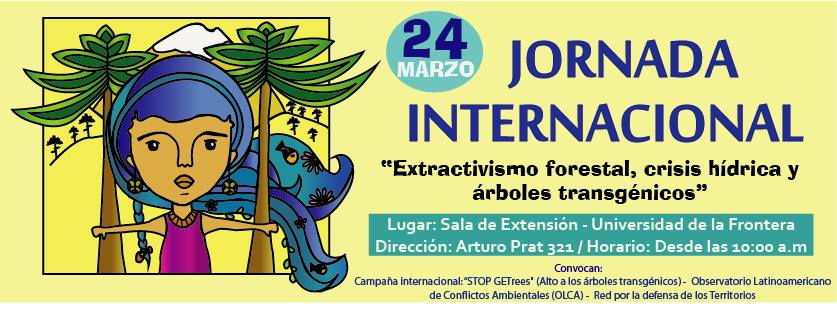 En la sala de extensión de la Universidad de la Frontera, calle Prat 321, se realizará este viernes 24 de marzo  una jornada internacional  a partir de las 10 de la mañana (hasta las 13,30 horas),  que es organizada y convocada por la Campaña internacional: “STOP GETrees», el Observatorio Latinoamericano de Conflictos Ambientales (OLCA) y la Red por la defensa de los Territorios, actividad que incluirá un diagnóstico regional sobre el modelo económico extractivista en la Región de la Araucanía y centro sur de Chile y los impactos a las fuentes de agua. A su vez, se compartirán los resultados de un  trabajo de investigación sobre la realidad transgénica en árboles de Chile y de manera comparada, se abordarán realidades continentales con la experiencia de representaciones de organizaciones de diferentes países.