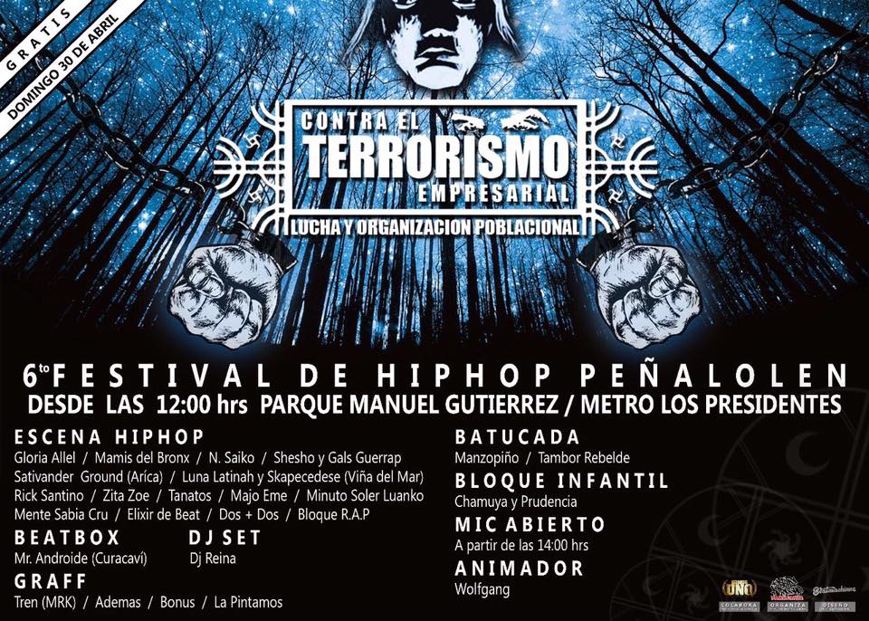 El día domingo 30 de abril, desde las 12 horas, se realizará el 6to Festival de Hip Hop en Peñalolén, Santiago, en el Parque Manuel Gutiérrez, actividad gratuita y abierta a toda la comunidad, organizada por Rap Autónomo Poblacional y que contará con hip hop, beatbox, batucada, bloque infantil, y más.