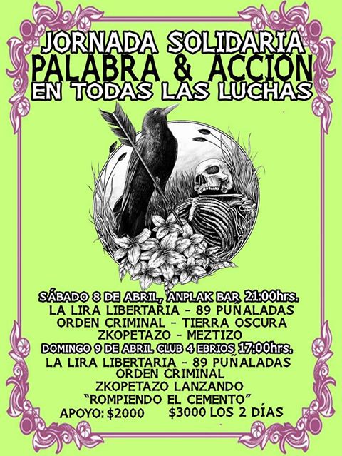 La jornada del sábado 8 de abril se presentará La Lira Libertaria, 8-9 puñaladas, Orden Criminal, Tierra Oscura, Skopetazo y Mestizo en bar Anplak desde las 21 hrs. Calle Caupolican #950.