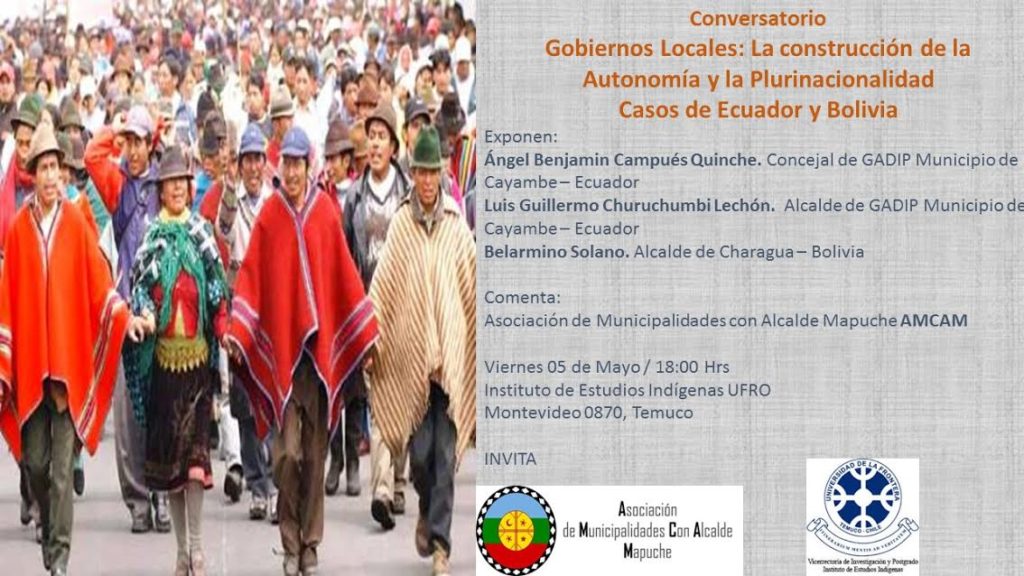 La Asociación de Municipios con Alcalde Mapuche y el Instituto de Estudios Indígenas de la Universidad de La Frontera , los invita al Conversatorio Gobiernos Locales: la construcción de la Autonomía y la Plurinacionalidad.