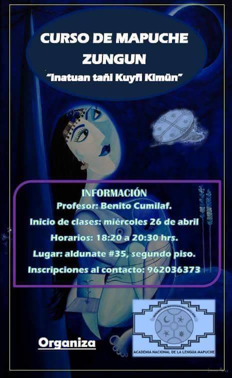 Organizado por la Academia Nacional de la Lengua Mapuche, se realizará en Calle Aldunate#35, Temuco, el Curso de Mapuche Zugun «Inatuan tañi kuyfi Kimun», actividad a cargo del Profesor Benito Cumilaf.