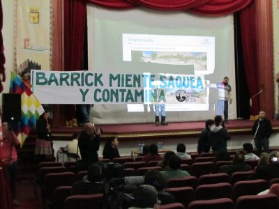 Nuestra intervención consistió en desplegar un lienzo durante la ronda de preguntas, con 3 grandes verdades acerca de la empresa: Barrick Miente, Saquea y Contamina!.