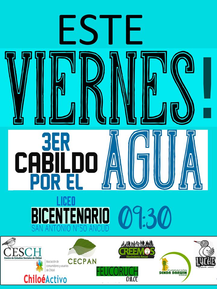 En esta tercera versión del Cabildo por el Agua, que es organizado por la Federación Provincial de Uniones Comunales Rurales de Chiloé (FEUCORUCH), Asociación de Consumidores y Usuarios de Chiloé (Chiloé Activo), Fundación Senda Darwin, Centro de Estudio y Conservación del Patrimonio Natural (Cecpan), Creemos Movimiento Ciudadano de Ancud, Agrupación Cultural Luche, Centro de Estudios Sociales de Chiloé (CESCH) y apoyado por la Municipalidad de Ancud, se pretende consolidar un espacio de diálogo y propuestas para la solución de la crisis hídrica que sufre el archipiélago de Chiloé, para lo cual se espera la asistencia de autoridades locales y regionales, dirigentes sociales y vecinales de todo Chiloé, y todos quienes estén interesados en participar.