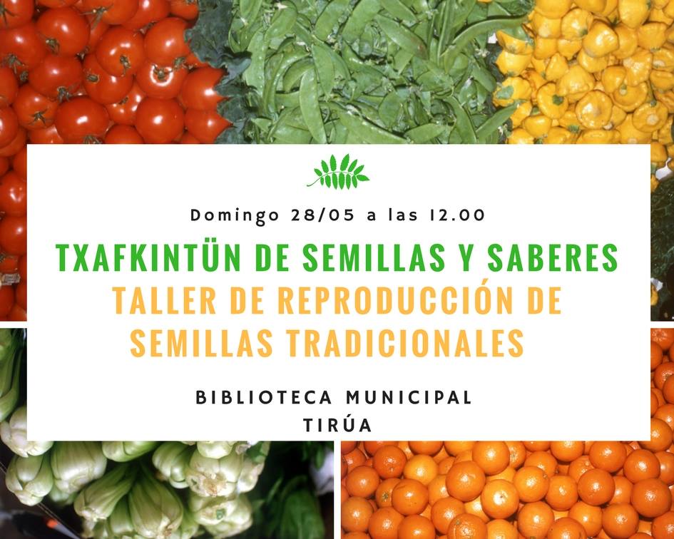 El domingo 28 de mayo desde las 12: 00 horas, en la Biblioteca Municipal de Tirúa se llevará a cabo la celebración del día del patrimonio con trafkintu de semillas y saberes, además de un taller de reproducción de semillas tradicionales a cargo de Fernanda Campos, quien promociona la actividad declarando: «Las semillas tradicionales son parte del patrimonio de todos los pueblos, ellas han sabido sobrevivir a los cambios climáticos, a las sequías gracias al resguardo de mujeres y hombres, son fértiles y son el legado para nuestros nietos».