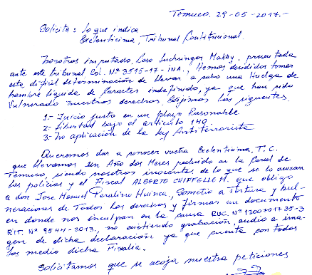 En una carta enviada al Tribunal constitucional en donde www.werken.cl tuvo acceso, los comuneros dan a conocer que ya llevan un año dos meses recluidos en la cárcel de Temuco injustamente, asegurando además su inocencia y acusan a las policías y en especial al fiscal Alberto Chifille de obligar a don José Peralino Huinca bajo tortura y vulneración de todo derecho y firmar un documento donde les inculpan por algo que no cometieron.