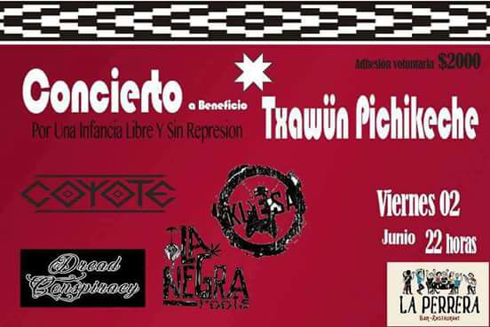 31/05/2017.- El día viernes 02 de junio, desde las 22 horas, en el Bar La Perrera (ubicado en Bernardo O’higgins 907, Temuco) se realizará un concierto en apoyo a la infancia libre y sin represión, actividad convocada por la Red por la Defensa de la Infancia, y que tiene por adhesión voluntaria un valor de 2.000 pesos.