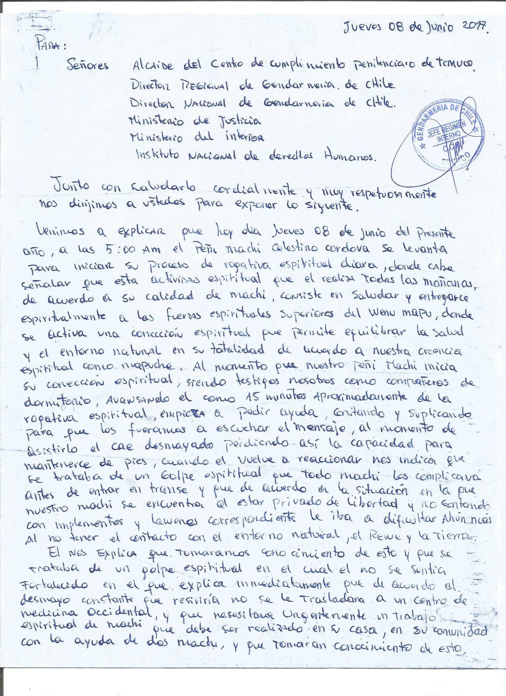 Venimos a explicar que hoy día jueves 8 de junio del presente año, a las 5:00 Am el peñi machi Celestino Cordova se levanta para iniciar su proceso de rogativa espiritual diaria, donde cabe señalar que esta actividad espiritual que realiza todas las mañanas, de acuerdo a su calidad de machi, consiste en saludar y entregarse espiritualmente a las fuerzas espirituales superiores del Wenu Mapu, donde se activa una conexión espiritual que permite equilibrar la salud y el entorno natural en su totalidad de acuerdo a nuestra creencia espiritual mapuche. Al momento que nuestro peñi Machi inicia su conexión espiritual, siendo testigo nosotros como compañeros de dormitorio, avanzando él como 15 minutos aproximadamente de la rogativa espiritual, empieza a pedir ayuda, gritando y suplicando para que los fuéramos a escuchar el mensaje, al momento de asistirlo él cae desmayado perdiendo así la capacidad para permanecer en pies, cuando el vuelve a reaccionar nos indica que se trataba de un golpe espiritual que todo machi los complicaba antes de entrar en trance y que de acuerdo a la situación en la que nuestro machi se encuentra al estar privado de libertad y no contando con implemento y lawen correspondiente le iba a dificultar aún más, al no tener el contacto con el entorno natural, el rewe y la tierra.