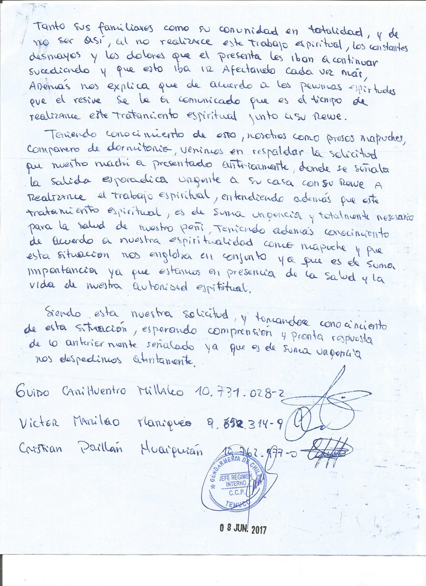 Teniendo conocimiento de esto, nosotros como presos mapuches, compañeros de dormitorio, venimos en respaldar la solicitud que nuestro machi a presentado anteriormente, donde se señala la salida esporádica urgente a su casa con su rewe a realizarse el trabajo espiritual, entendiendo además que este tratamiento espiritual, es de suma urgencia y totalmente necesario para la salud de nuestro peñi, teniendo además conocimiento de acuerdo a nuestra espiritualidad como mapuche y que esta situación nos engloba en conjunto ya que es de suma importancia, ya que estamos en presencia de la Salud y la vida de nuestra autoridad espiritual.