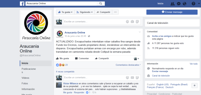 Del mismo modo en otro comentario se leía “Estimado los peñi andaban buscando sus caballos perdidos y sabían que estaban ahí, llegaron a la casa del ex paco y sin mediar nada el tipo comenzó a disparar abatiendo inmediatamente a dos de los 5 que andaban, esto lo reconocieron los propios trabajadores que estaban ahí. Los medios no hablan de eso! Porque están ensañados con criminalizar la lucha mapuche!”.