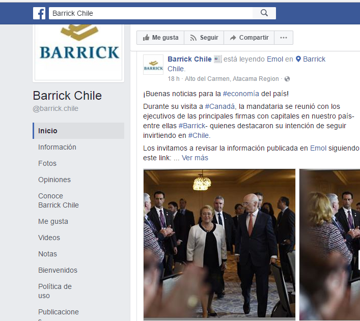 4- La complicidad y unión entre Gobierno y empresa es innegable, y es a tal punto que no pueden disimular; juntos como amigos destruyen nuestras vidas, economías, sueños y cultura. Muestra de esto es que la misma empresa el día jueves festinaba con el encuentro entre Bachelet y la trasnacional en su página de Facebook (Barrick Chile), así como en la misma página se puede ver una foto reciente en donde aparecen abrazados y muy alegres el Director Ejecutivo para Barrick en Chile René Muga, su gerenta de Medio Ambiente Alejandra Vial y la Ministra de Minería Aurora Williams, recordemos ex trabajadora de Luksic en Antofagasta Minerals, empresa que hoy explora el proyecto El Encierro junto a Barrick y cuyo dueño ha sido asesor de la trasnacional.