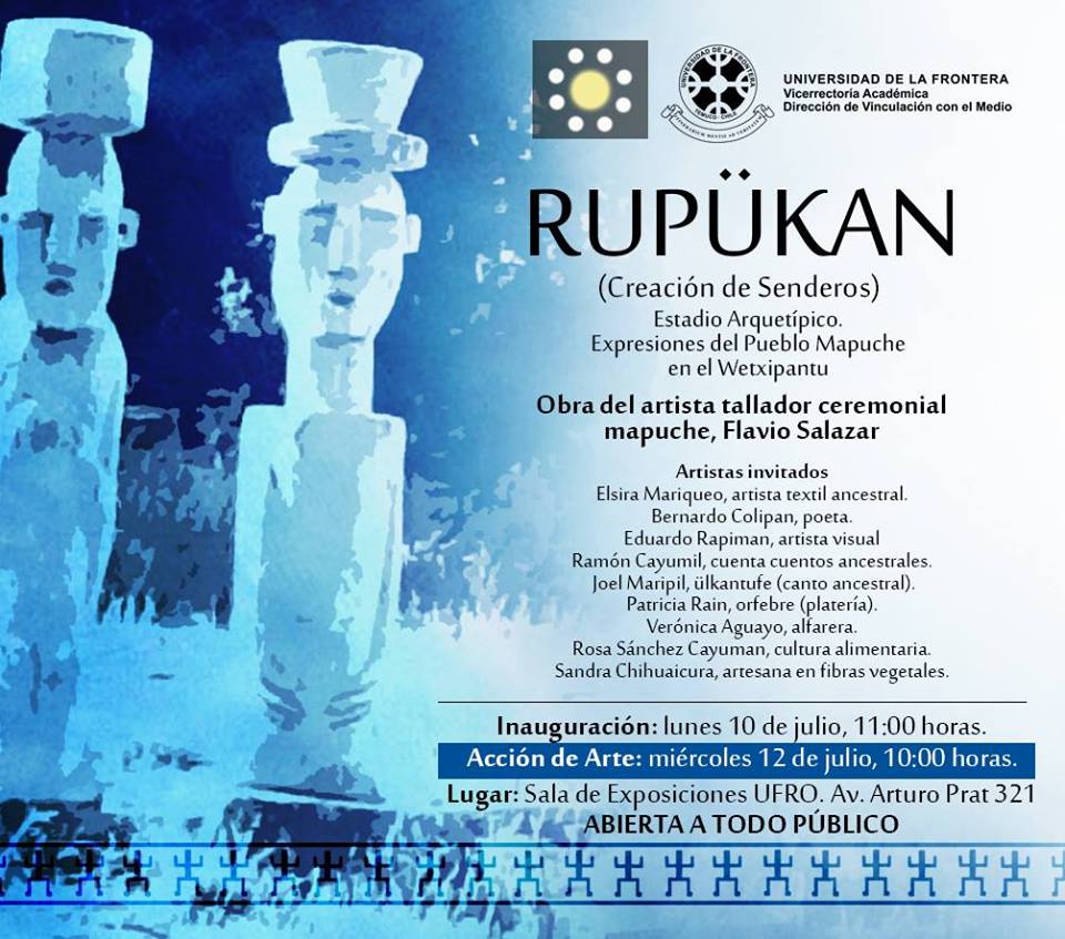 El artista tallador ceremonial mapuche, Flavio Salazar, presentará su obra “Rupükan /Creación de Senderos”, muestra de Chellmamüll y Acción de Arte destinada a la difusión y puesta en valor de las expresiones tradicionales y contemporáneas del Pueblo Mapuche y de quienes las desarrollan, a través de una propuesta que integra elementos del arte y la espiritualidad.