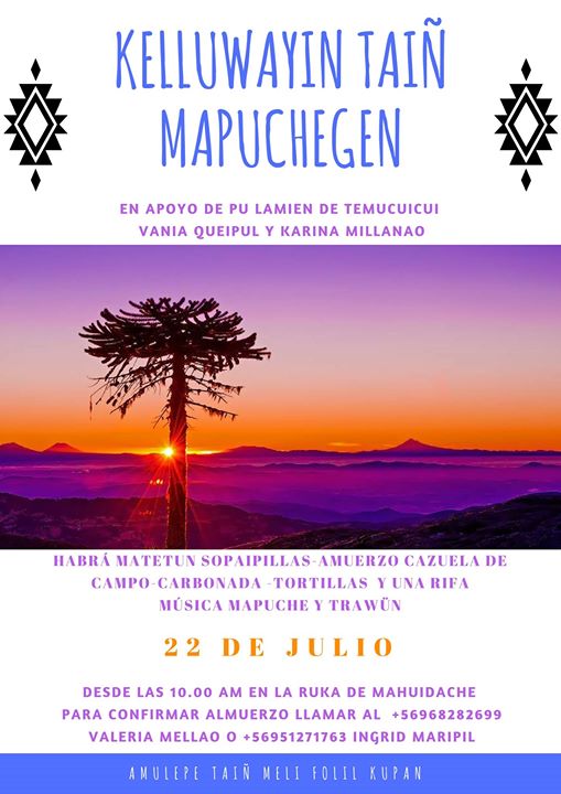 “Con mucho cariño se extiende la invitación KELLUWAYIN TAIÑ MAPUCHEGEN en apoyo de Pu Lamien VANIA QUEIPUL y KARINA MILLANAO de Temucuicui quienes están siendo perseguidas por el estado Chileno! En este trawün que se realizara el 22 de julio en Mahuidache haremos una rifa, tendremos tortillas al rescoldo, sopaipillas con pebre, cazuela de campo, carbonada y música mapuche! Compartan y difundan lamien! Amulepe taiñ Meli Folil Kupan”, señalan.