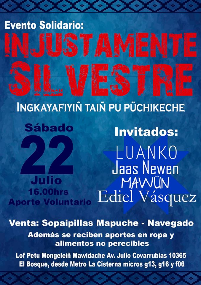 El día sábado 22 de julio, desde las 16 horas, en el Parque Mahuidanche (ubicado en Julio Vocarrubias 10365, El Bosque de Santiago) se realizará el evento solidario en apoyo y a beneficio al niño Silvestre Torres (niño baleado en Ercilla el 20 de abril por Carabineros en un allanamiento, recibiendo diversos perdigones en su pierna).