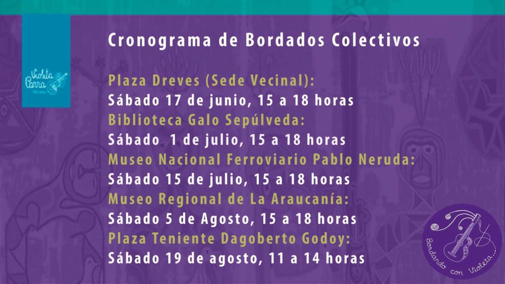 Ambas conversarán y compartirán sus experiencias en la jornada a cargo del proyecto “Bordando con Violeta”, que busca reconocer la vida, obra y aportes de la cantautora y artista y reflexionar del mismo modo sobre la importancia de los Derechos Humanos, iniciativa financiada por el Fondart Nacional del Consejo Nacional de la Cultura y Las Artes.