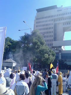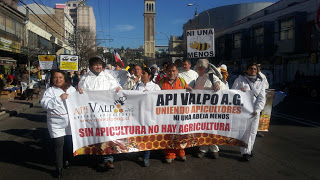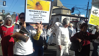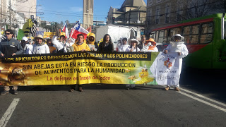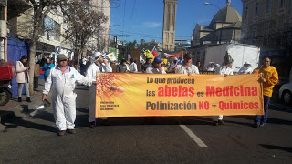 Con sus trajes blancos y sus ahumadores, las y los apicultores marcharon por las calles de Valparaíso coreando consignas como “Por las abejas y por la vida, No a los pesticidas” y pancartas alertando “En Chile matan las abejas” y “Protejan el bosque nativo”. Llegaron desde Queilén, Chiloé; de San Clemente (Maule), de Rancagua (O’Higgins); de Santa Bárbara, Florida, y Lloicura (BioBio), de Melipilla y Paine (Metropolitana). Los locales, venían de Limache, San Esteban, Petorca, Cabildo, Cartagena, San Antonio y otras localidades, y saludaron también las pancartas de la Red de Acción en Plaguicidas que exigían la prohibición de los neonicotinoides de Bayer y el glifosato de Monsanto.