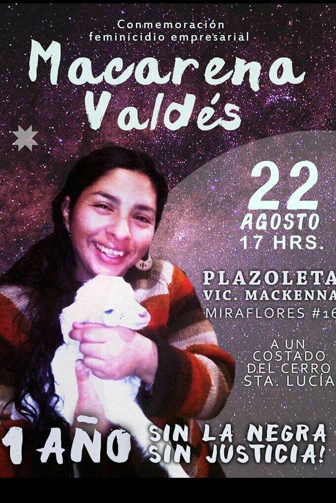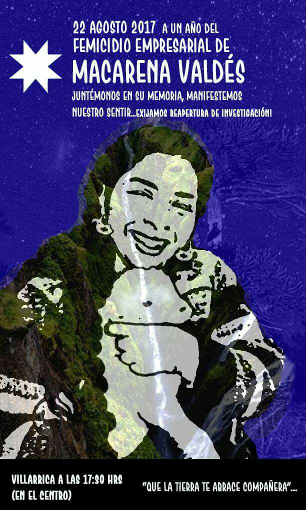 En diversas localidades de Chile se está convocando a manifestaciones en el marco del primer aniversario de la muerte de Macarena Valdés, cuyo deceso se relaciona con el conflicto hidroeléctrico que ha instaurado la transnacional austriaca RP Global en el territorio de Tranguil, comuna de Panguipulli, cuyo hecho sigue en la impunidad bajo la inoperatividad e indiferencia del Ministerio Público.