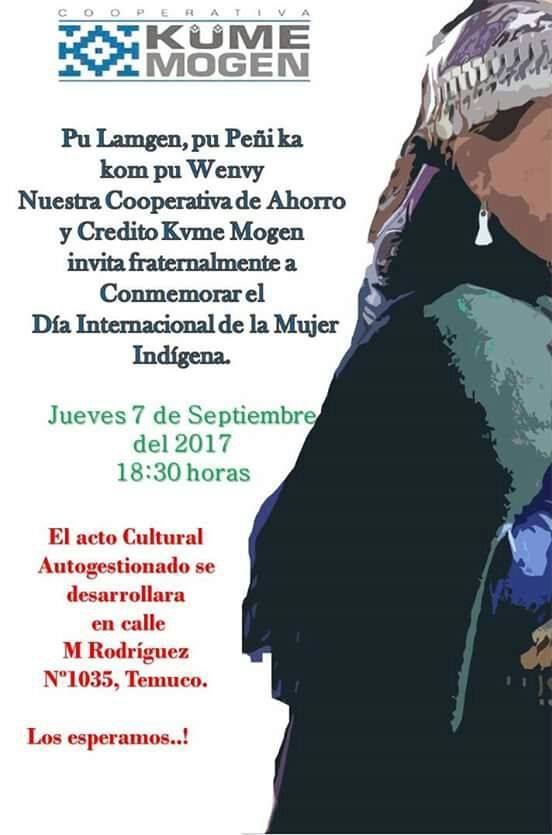 Una de las actividades es la que está convocando en Temuco la Cooperativa de Ahorro y Crédito Kvme Mogen el día jueves 7 de septiembre 2017 a las 18:30 horas en la Caja de Crédito Prendario, más conocido como la tía rica., calle Rodríguez # 1035, la que tendrá un acto cultural y a su vez, se realizar un homenaje a Ada Huetecol y Fabiola Antiqueo, entre otras mujeres mapuche que han debido enfrentar la violencia estatal.