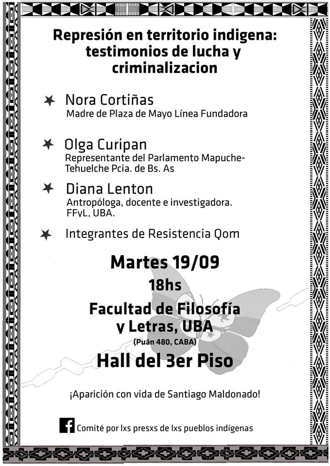Charla «Represión en el territorio indígena: testimonios de lucha y criminalización» y por la aparición de Santiago Maldonado organizada por el Comité por lxs Presxs de los Pueblos Indígenas.