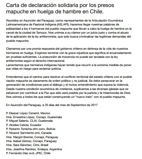 La Articulación Ecuménica Latinoamericana de Pastoral Indígena (AELAPI), hace un llamado solidario con los 4 hermanos del pueblo mapuche que llevan a cabo la huelga de hambre en la cárcel de la ciudad de Temuco. “Nos unimos a su clamor por un juicio justo y contra el abuso de la aplicación de la ley antiterrorista, que solo busca criminalizar las legítimas demandas del pueblo mapuche”, señalan.