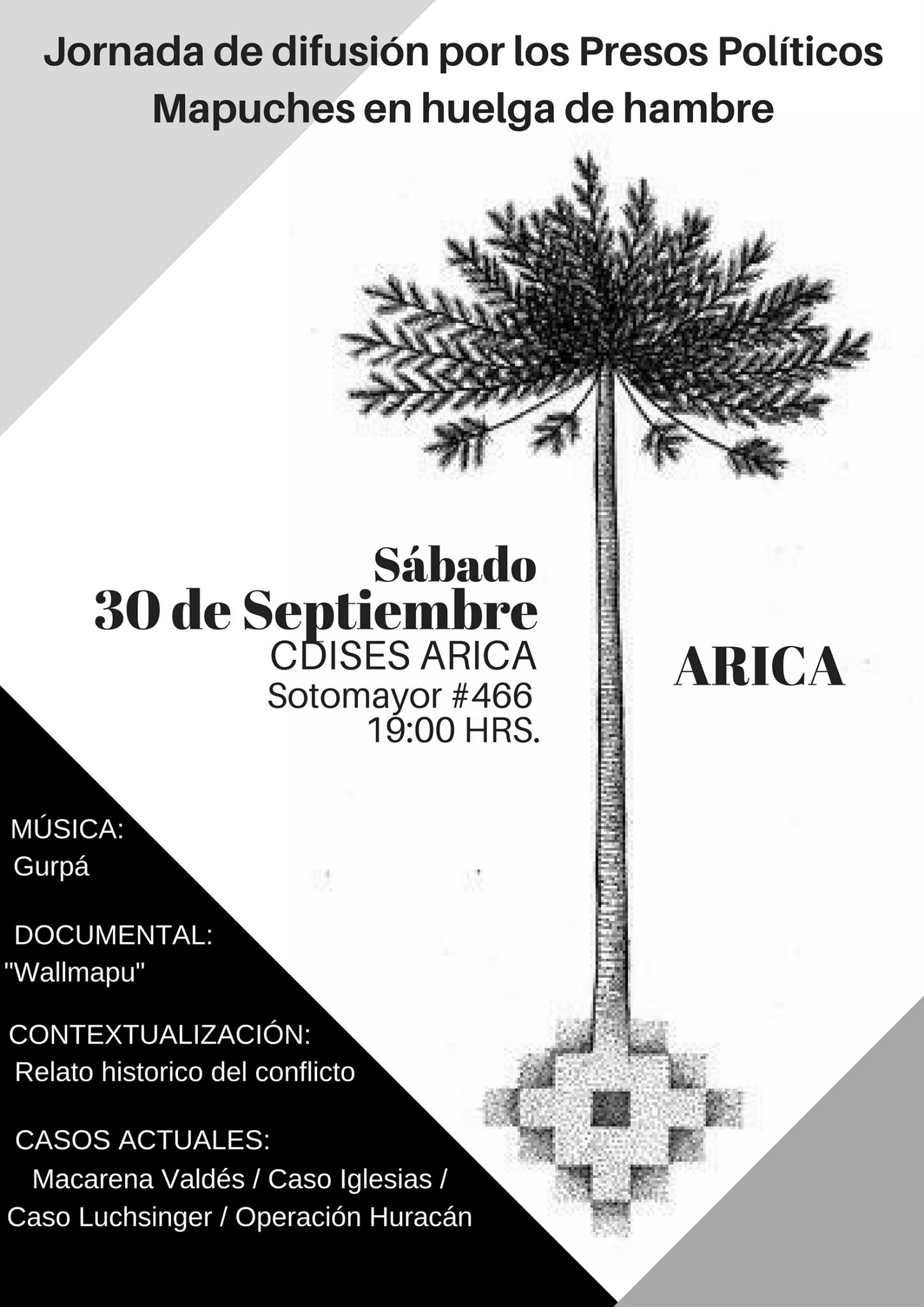 A ello agregan: «Ante esta situación la solidaridad es la respuesta más convincente para romper el cerco mediático, es por esto que levantamos la invitación a toda la comunidad de la ciudad de arica a participar de manera activa en la “jornada de difusión por los presos políticos mapuches en huelga de hambre”, la actividad se realizará este sábado 30 de septiembre en el CDISES Arica (Sotomayor 466) desde las 19:00 hrs. Petitorio preso político mapuche en huelga de hambre: – juicio justo en un plazo razonable . – no a la aplicación de la ley 18.314 (denominada ley antiterrorista). – no a la utilización de testigos sin rostros. – revocación de la medida cautelar de prisión preventiva».
