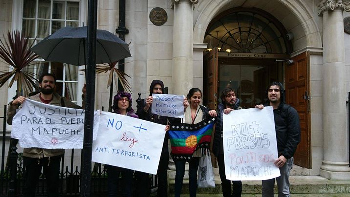 Manifestación afuera de la embajada Chilena en Londres en solidaridad con los presos políticos y en protesta por la escalada represiva de los últimos días. Más info acá.