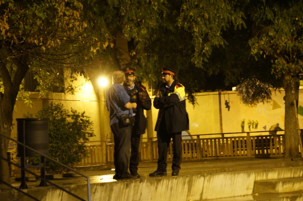 “Todos a sus posiciones”, se escucha de repente. Automáticamente la multitud se agrupa frente a la puerta del edificio en silencio y una calma tensa impregna el ambiente. Los agentes llegan, preguntan por la actividad, comprueban que no hay material relativo al referéndum, levantan el acta y permanecen en la calle, apartados y observando la muchedumbre. Antes, uno de los manifestantes les ofrece un chocolate caliente, que ellos rechazan agradecidos. La atmosfera se relaja y la gente sigue comiendo, conversando y compartiendo tranquilamente.