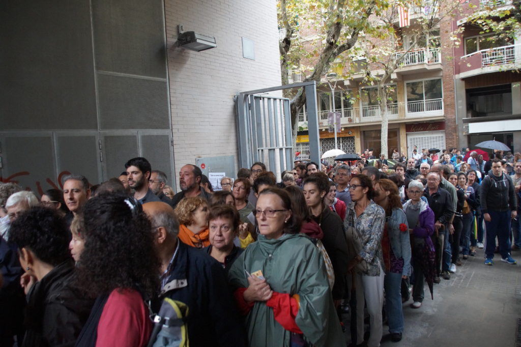 Las colas desbordan la escuela por los dos accesos de que dispone. La gente se amontona entre aplausos y gritos de “¡Votarem!”. Los voluntarios piden que en primer lugar de las larguísimas colas se coloquen las personas mayores, aquellas que conviven con alguna capacidad diferente y las mujeres embarazadas. Las filas de personas se articulan poco a poco mientras varias personas se presentan como voluntarios espontáneos para constituir las mesas ante el llamado de los organizadores. Eso porque los miembros que fueron oficialmente convocados no pudieron ser notificados debido a la intervención política y judicial de Madrid en los preparativos del referéndum.