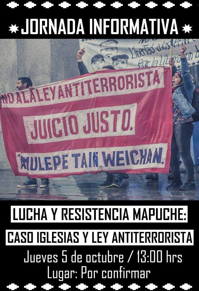 La organización, extiende la invitación: «Como estudiantes de la facultad de Ciencias sociales, actualmente movilizados en apoyo al pueblo mapuche, hemos realizado diferentes actividades que hagan visible la causa. En ésta oportunidad levantaremos esta jornada, titulada «Lucha y resistencia mapuche: caso iglesias y ley antiterrorista» surge con el objetivo de informar y concientizar a toda la comunidad, en especial a la estudiantil, que muchas veces se exenta de las actividades por desconocimiento».