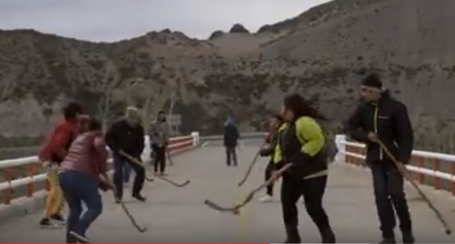 El rio Jeinimeni es la frontera geográfica y política entre Chile y Argentina. En la víspera del mal llamado “día de la raza”, fecha donde empieza la colonización occidental a nuestro continente, caminamos alrededor de 18 personas, entre niñas, niños, jóvenes y adultos hasta el puente que une los dos países para tomarlo como cancha. Con una raya en Chile y la otra en Argentina, nuestros cuerpos mestizos jugaron para borronear la frontera, el sonido de los guiños al raspar el cemento, tacharon la línea que impusieron los estados autores de La Conquista del Desierto y la Pacificación de la Araucanía, estados que cobardemente exterminaron con fuego y sangre culturas enteras, pero a pesar de todo no pudieron con la nuestra. El palín es un acto político, es un juego, un compartir, un ejercicio ritual, una ceremonia, un entrenamiento y un encuentro fraternal para conocernos y resolver conflictos. Hoy nuestra gente sigue viviendo la usurpación territorial a manos del estado y empresas privadas, tierras que por derecho ancestral le pertenecen al pueblo mapuche.