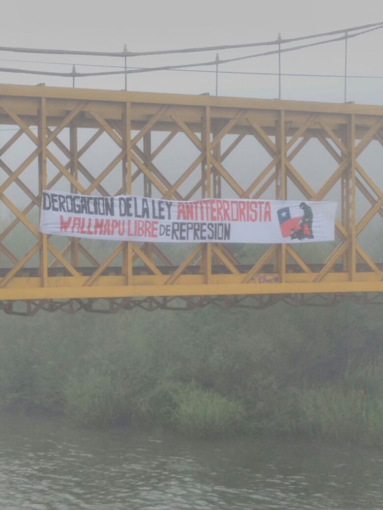 En el puente ferroviario que une las intersecciones de Temuco y Padre las Casas, el puente tercero e inmediaciones, se realizó una intervención que exige la derogación de la Ley antiterrorista la que se ha implementado con diversos abusos e instrumentalización política para perseguir causas mapuche.