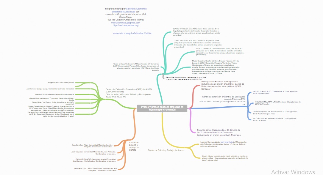 A continuación, acceder a Infografía sobre estado carcelario Presos Políticos Mapuche realizada por Libertad Soberanía Autonomía Audiovisual con información difundida por la organización Mapuche Meli Wixan Mapu.