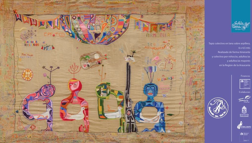 07/11/2017.- Desde junio a agosto, 570 personas y 38 organizaciones sociales de Temuco y sus alrededores participaron de la reproducción e interpretación libre de la arpillera bordada colectivamente “Contra la Guerra”, obra de 4,5 por 6 metros que recorrió de forma gratuita e itinerante organizaciones sociales, establecimientos educacionales, museos, bibliotecas, centros de adulto/a mayor, en homenaje al centenario del nacimiento de la cantautora y artista Violeta Parra Sandoval.