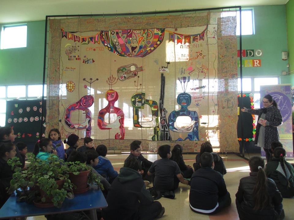 Luego, la arpillera se exhibió en la Escuela Manuel Recabarren, jornada que contó con la declamación poética de Yasmín Moncada, y la interpretación musical de la soprano lírica Luisa Barrera, quien junto a músicos funcionarios del establecimiento; Carlos Urrutia en la guitarra, Rodrigo Mendoza en el teclado y Daniel Melillan en la percusión, interpretaron variadas canciones de Violeta Parra. La jornada finalizó con una coreografía musical por estudiantes de 6º año que interpretaron “La exiliada del Sur”.