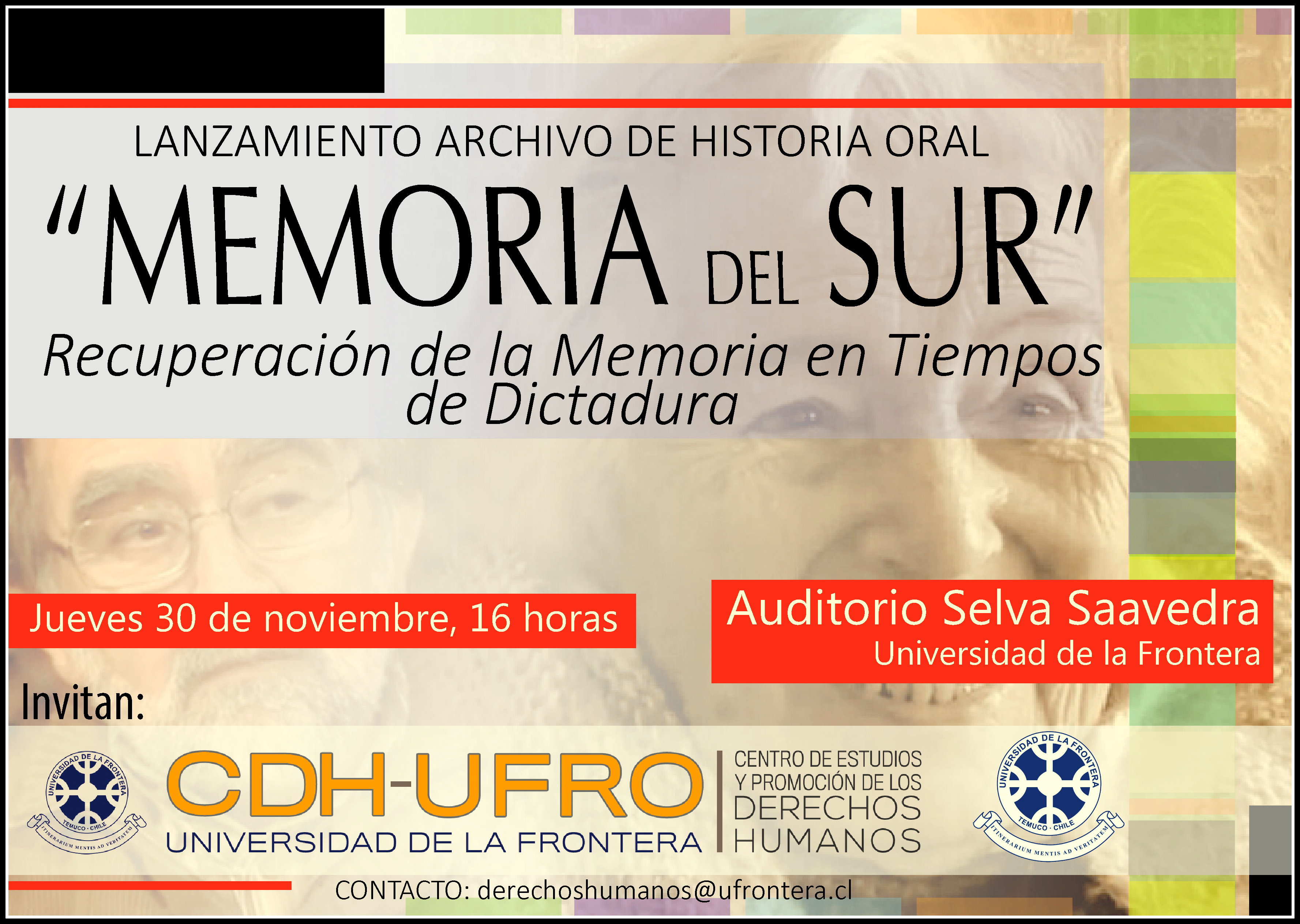 El día jueves 30 de noviembre a las 16:00 horas en el salón Selva Saavedra de la Universidad de La Frontera (Frsco. Salazar 1145, Temuco) se realizará el lanzamiento del Archivo de Historia Oral «Memorias del Sur. Recuperación de la memoria en tiempos de dictadura», el cual es organizado por el Centro de Estudios y Promoción de los Derechos Humanos de la Universidad de La Frontera.