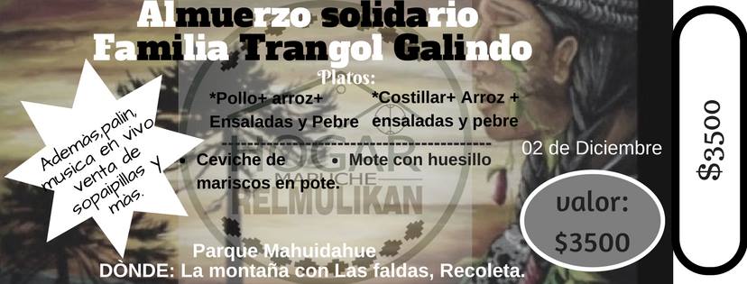La organización invita: «se realizará esta actividad a beneficio en nombre de la Familia Trangol Galindo, que aun mantienen una huelga en la cárcel de Temuco, es por ello que como Hogar de mapuche estudiantes hemos decido realizar un evento en el Parque Mahuidahue ubicado en la comuna de recoleta, con diversas actividades, tales como: ALMUERZO SOLIDARIO. Platos. *costillar de cerdo+papas,arroz ensaladas y pebre a gusto.